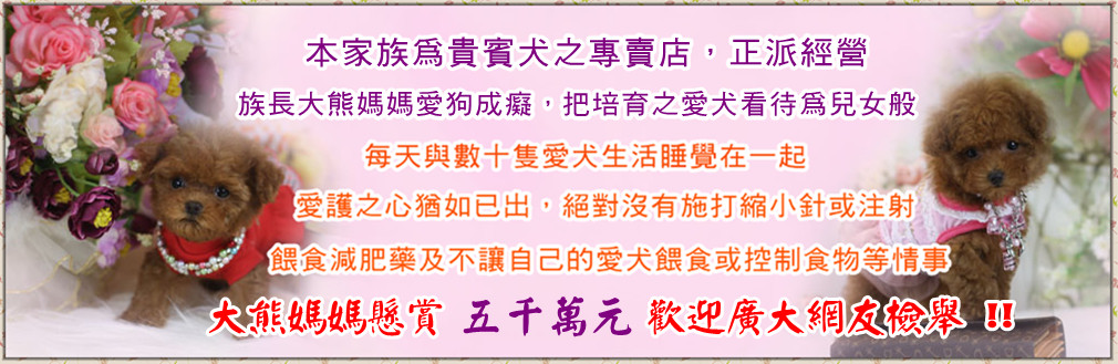 「世界上最有力量的是夢想40」出版了... 英國 Corporate Live Wire 2020/21年度最佳犬種培育聲望獎... 108年度台南市特定寵物業評鑑... 認識我們的種公爸比與種母媽咪... 2018年聖誕節後調漲預告... 幼隆2018年特此感謝各位爸比媽咪的信任與支持... 大熊媽媽帶你認識台灣的台南!... 24小時視訊開放-大熊媽媽與泰迪熊的世界... 毛小孩真正成為一家人!農委會完成寵物歸戶系統... 視訊公告... 2018年春節公告... 漲價訊息... 幼隆名犬培育中心 官方Line群上線囉!! @teddymommy... 台灣府城台南一日遊: 幼隆家族朋友來訪~大熊媽媽親自接待... 來自"屏東大仁科技大學美容科"學生們的感謝卡... 小玩具型貴賓犬泰迪熊年度超級優惠 (僅限台灣)... 購買幼隆茶杯貴賓犬,免費台南高鐵台南機場接送... 幼隆血統書擁有國際認證!!... 事件處理:香港口袋茶杯泰迪熊(菲菲)因飼主照顧不周,營養不足導致長期低血糖,最後併發休克死亡。... 供不應求,口袋泰迪熊 (玩具貴賓犬).... 茶杯貴賓風靡義大利!VanityPets美容健康專欄!... 幼隆(毛小孩貴賓犬)到台灣大仁科技大學上課囉!... 幼隆泰迪熊貴賓犬報平安... 幼隆第二基地新建中!!... 泰迪熊化身傳說-來自台灣台南大熊媽媽(泰迪熊媽媽)... 口袋、超小、小茶杯貴賓犬(泰迪熊)飼養注意須知... 春節期間採預約制... 幼隆名犬培育中心購買以及健康保障合約... 結盟經營行銷... 幼隆幼犬精緻區-各色茶杯貴賓犬、玩具貴賓犬... 聖誕節玩具泰迪熊貴賓犬與您一同過聖誕... 口袋茶杯泰迪熊(貴賓犬)夢幻登場-無與倫比的美麗... 香港紅色口袋茶杯泰迪熊(貴賓犬)JAM JAM跟大家問好... 各種顏色茶杯泰迪熊貴賓犬,紅貴賓 黑貴賓 白貴賓 巧克力貴賓 奶油貴賓 灰貴賓... 幼隆名犬培育中心 - 僅此一家,絕無分店!... 感謝世界各地的爸比媽咪~給了茶杯泰迪小熊一個充滿愛與溫暖的家... 義大利米蘭Elena媽咪開心帶寶貝們出門曬太陽囉... 五位口袋茶杯泰迪熊寶貝們的義大利威尼斯新生活... QR Code 聯絡資訊 ( 快來掃描我 ) >u<... 獨家特輯: 5位茶杯泰迪熊加入義大利超級大家族的故事... 茶杯介小茶杯貴賓犬(泰迪熊)阿布先生往福州飛高高 (June 27, 2014)... 口袋茶杯貴賓犬(泰迪熊)三姊弟飛往義大利 (June 22, 2014)... 大茶杯貴賓犬(泰迪熊)飛向深圳 (June 27, 2014)... Horlicks甜美杏色小玩具貴賓犬漸漸適應香港生活... 2014 茶杯貴賓泰迪熊寶貝大集合... 快跟著大熊媽媽尋找茶杯泰迪熊的足跡... 新生代寶寶終於露臉了,狗狗資訊持續更新中... 2013幼隆珈喬所有團隊全體員工尾牙歡唱PARTY... 日本玩具貴賓狗 挑戰續任警犬!!... 2012年貴賓犬品質精緻化趨勢 幼隆認養活動開跑... For any English inquiry please contact us on +886963110478★★... 日本語の問い合わせも対応しております+886 975785398★★★... 可隨時以 sms / whatsapp / LINE 與我們聯絡 +886 975785398★+886 9631104... 感謝*壹週刊第382期專訪*中視新聞採訪*...