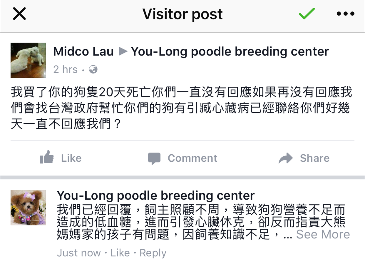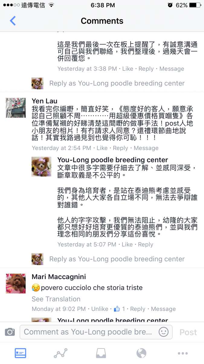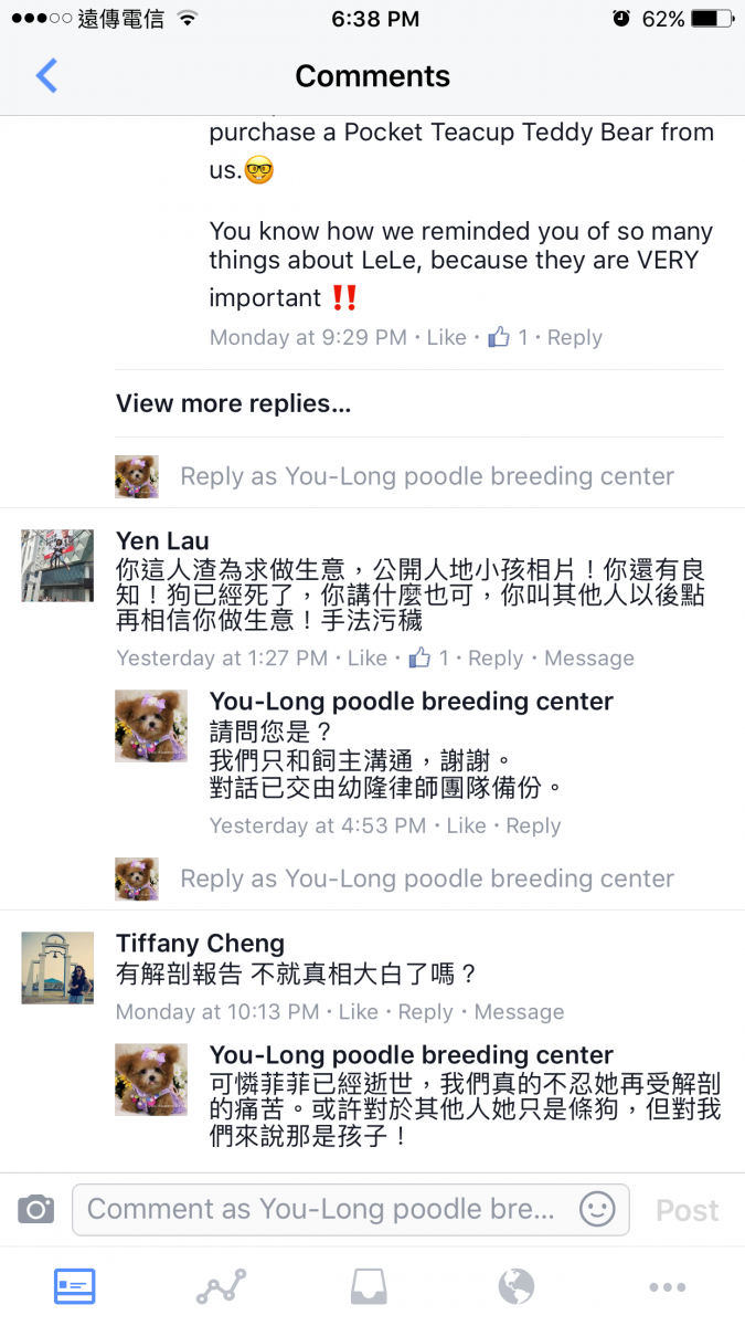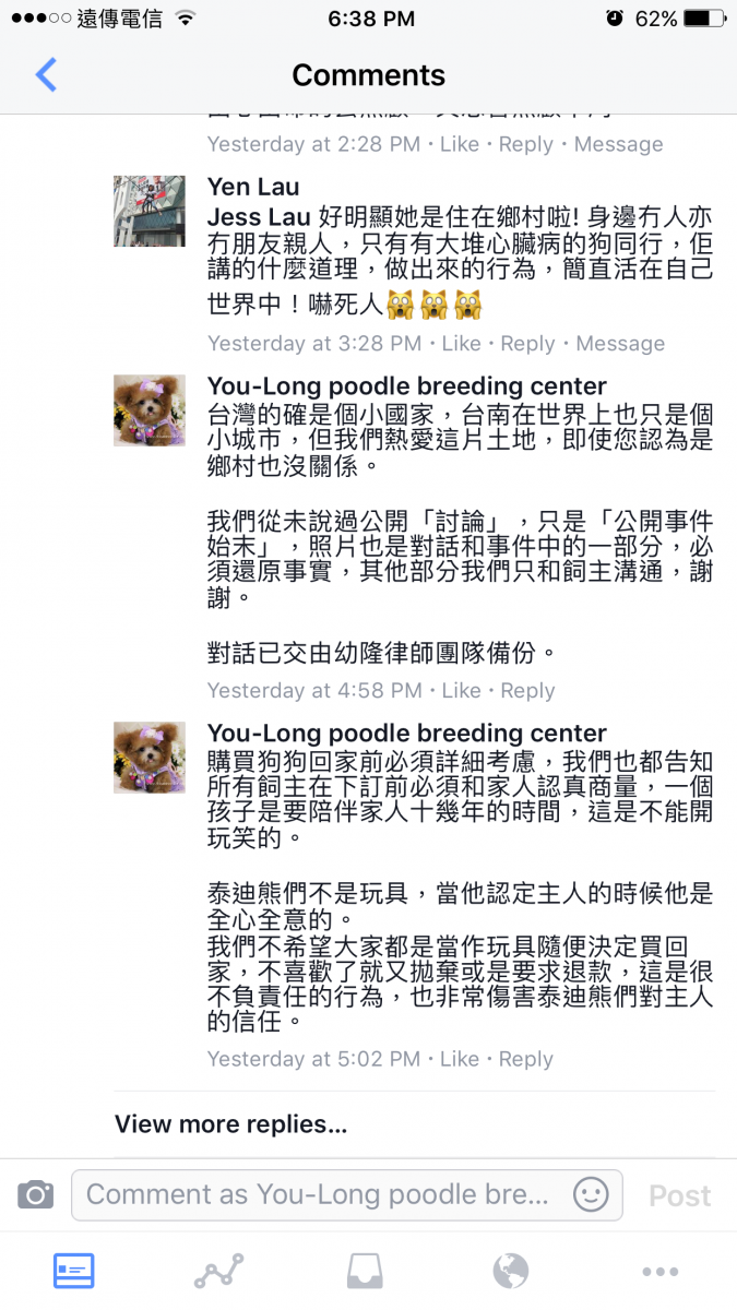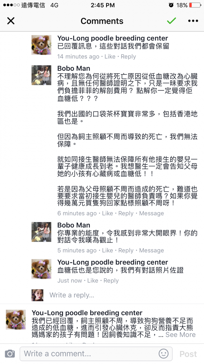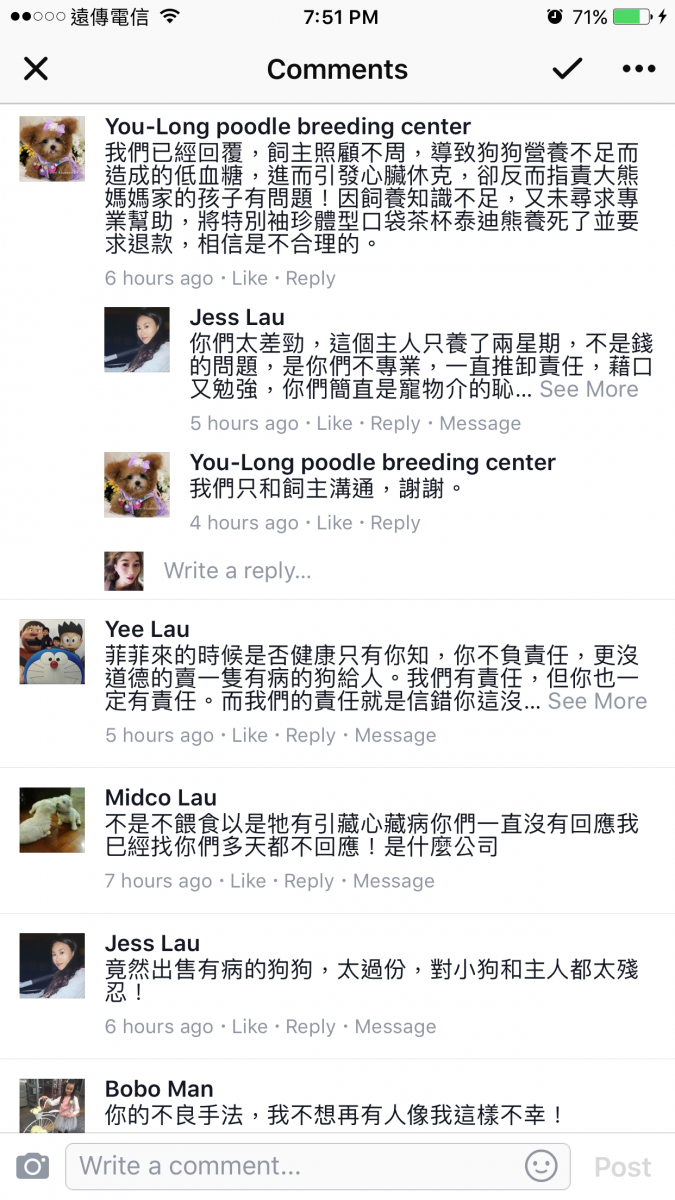 也出現幫腔,四處留言抹黑幼隆名犬的商譽