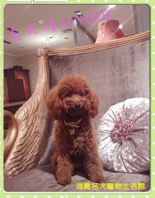 我偶尔会想,当时选一只茶杯贵宾好了,可是又很担心那就不会是现在的我的宝贝YOYO了,呵呵.即使是这样在大连我也没遇到几只比YOYO更出色的玩具贵宾,因为在给她找男朋友的时候物色了好久,成色真的差太多了,确实有比YOYO身材小巧的,但是脸蛋就差太多了,毫无美感可言,不像YOYO这么甜美可爱!而且YOYO真的像贵犬舍宣传的一样越养颜色会越红哦,虽然我也接受YOYO长大会变色这样的事实,但我觉得这贵宾这个犬种比较特殊,毛色跟毛量是评判外貌很重要的一个方面.