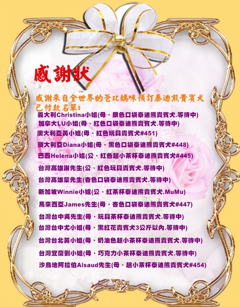 特此感謝各位爸比媽咪對幼隆名犬培育中心的支持與信任